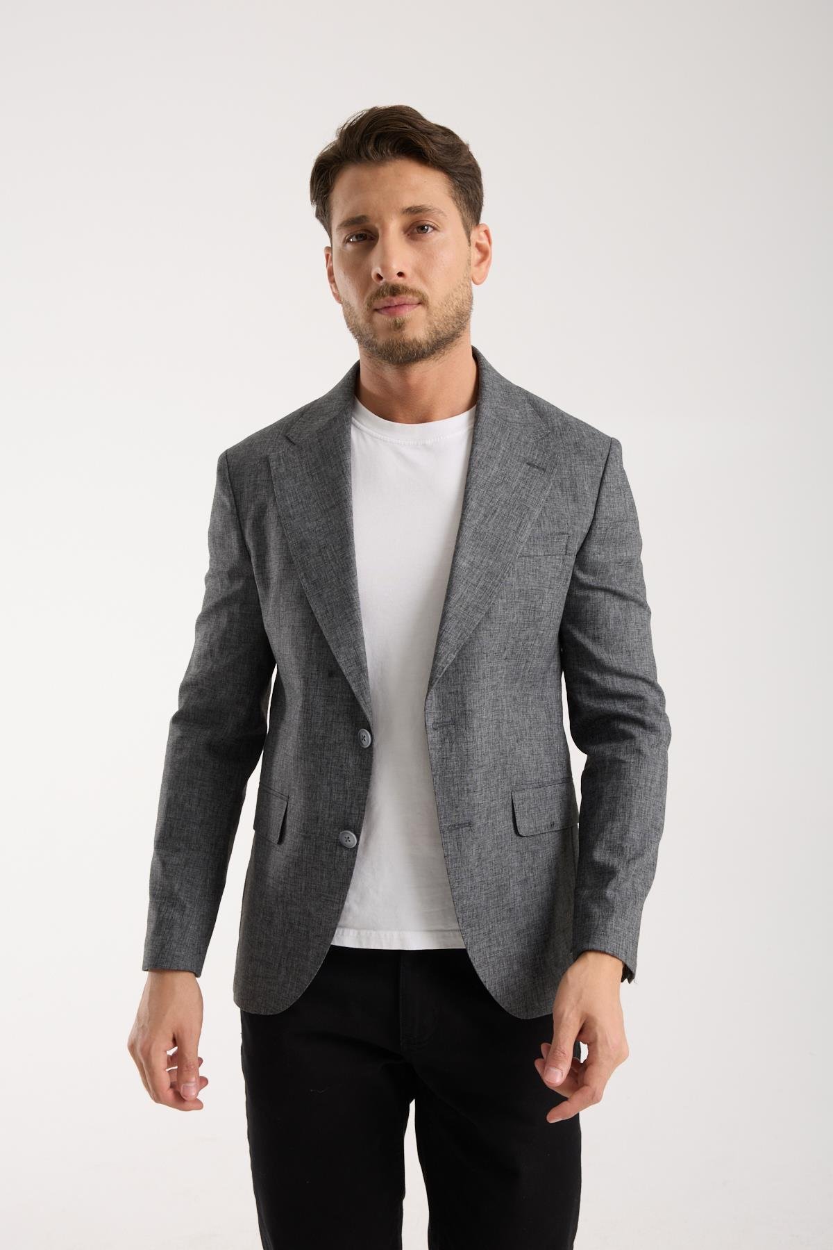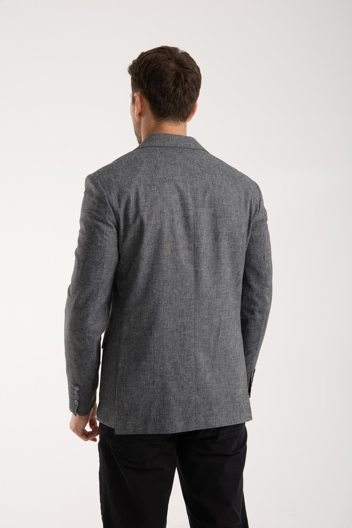 Erkek Gri Slim Fit Keten Dokulu Klasik Ceket