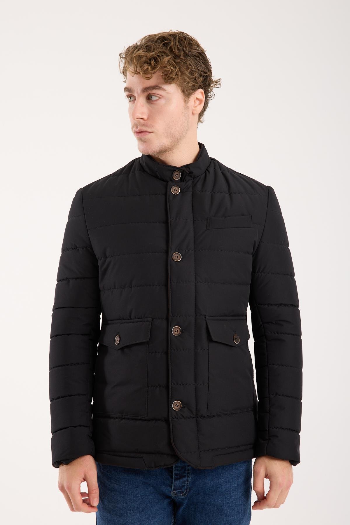 Maserto Erkek Siyah Hakim Yaka Düğmeli Kapitone Mont